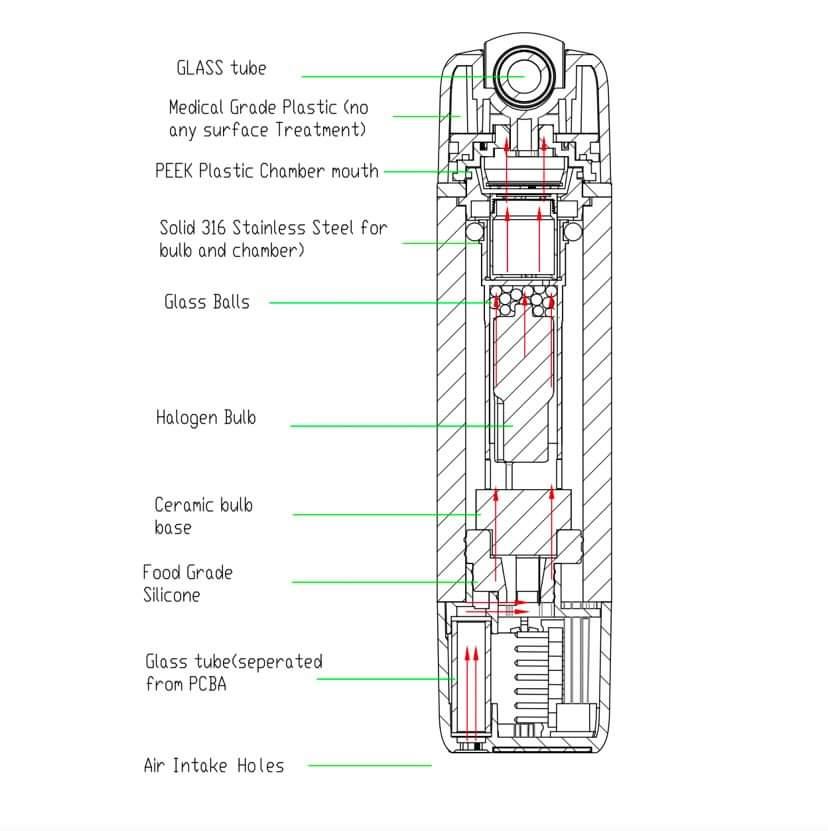 When you inhale, the heated air first passes through the glass balls and then the herbs to generate vapour. The combination of the convection heat from the halogen bulb and the radiation heat from the glass balls produces a vapour that is consistent and flavourful.